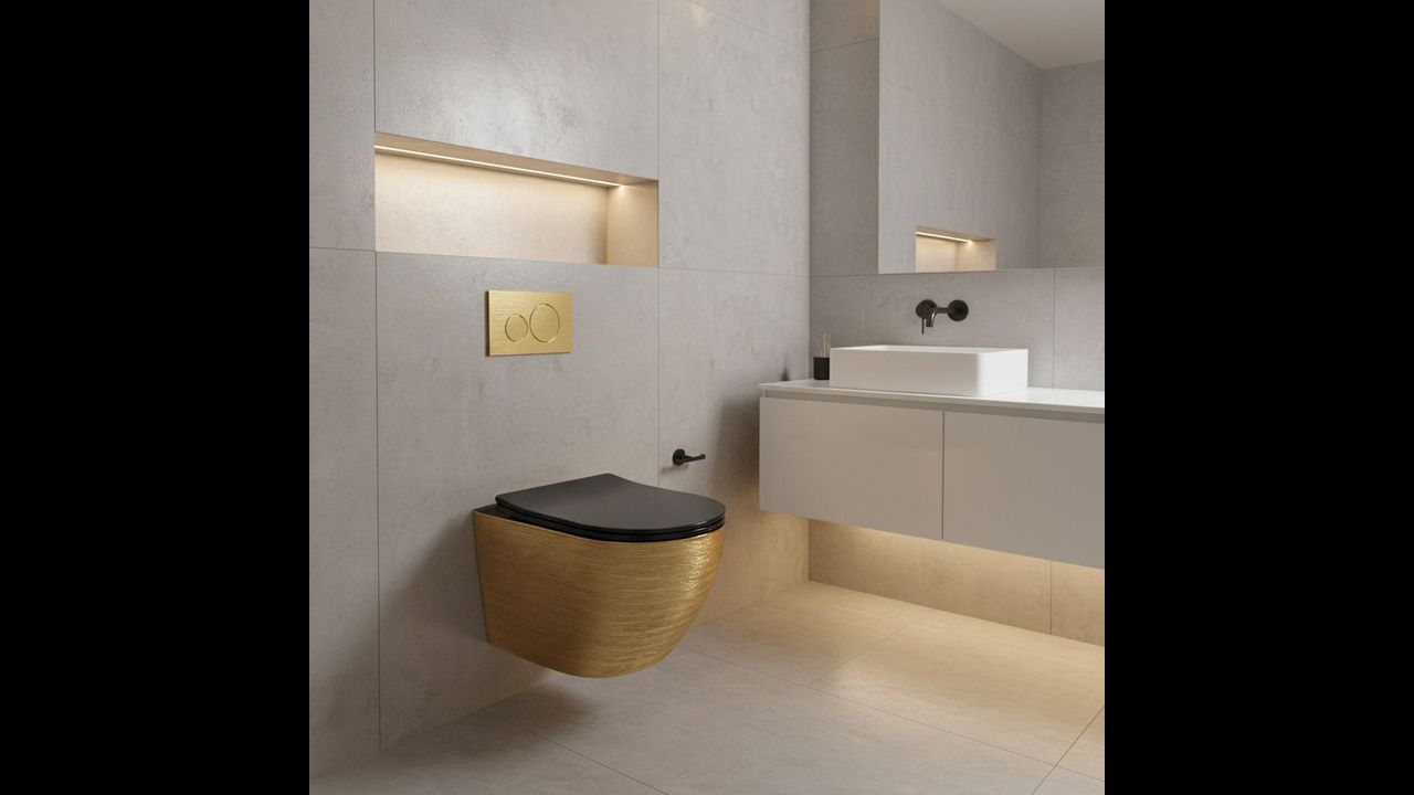La cuvette WC suspendue Carlo Mini Tornado dans une combinaison exclusive de noir et d’or brossé est la solution idéale pour ceux qui souhaitent donner à leur salle de bains une touche moderne et luxueuse. Sa finition unique en fait un élément marquant de l’agencement, parfaitement assorti aux robinetteries design et aux accessoires contemporains.