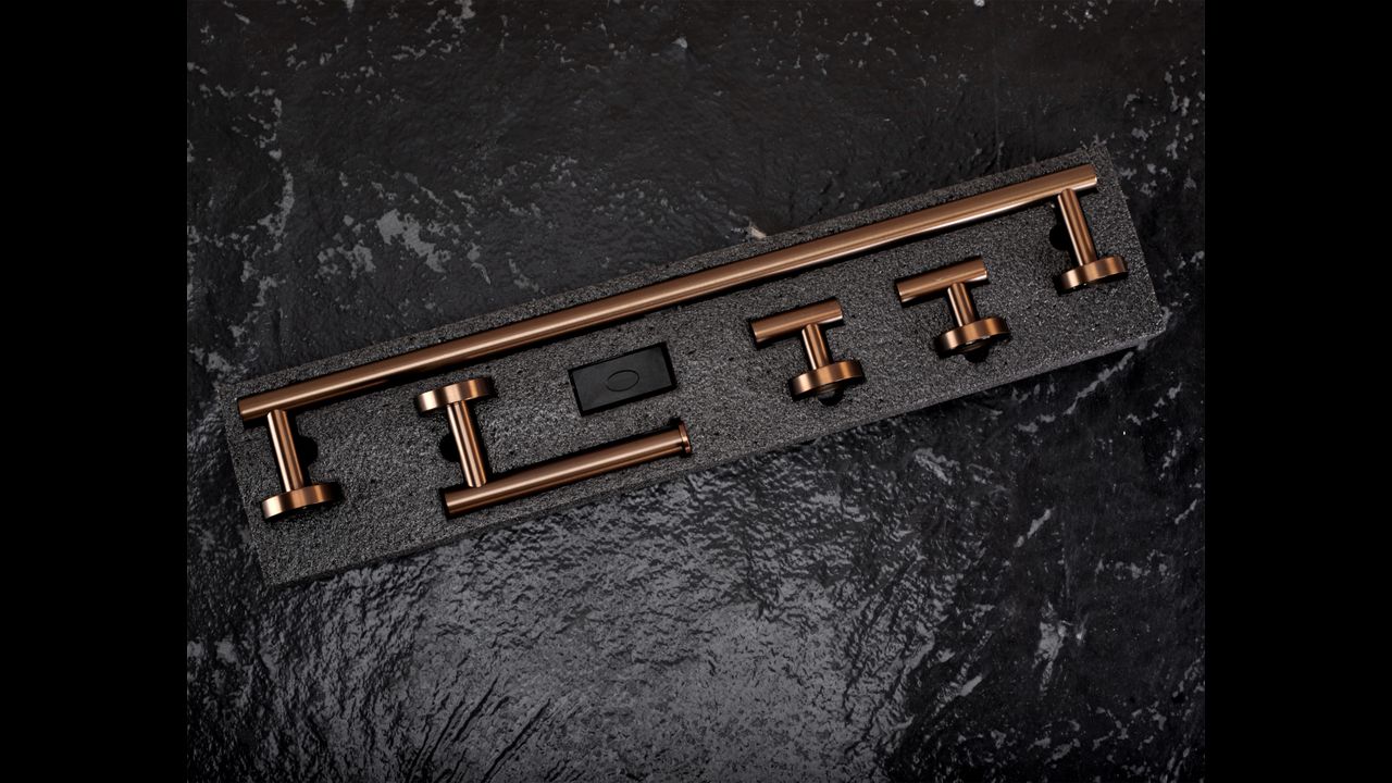 Tous les éléments sont fabriqués en métal de haute qualité, résistant à l’humidité et à la corrosion. La finition en cuivre brossé confère à l’ensemble élégance et caractère unique, tout en restant résistante aux traces d’usage. Les accessoires se fixent au mur, assurant stabilité, durabilité et confort d’utilisation.