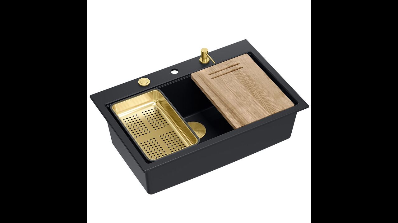 Ce modèle est très généreusement équipé d’accessoires de cuisine supplémentaires. L’évier comprend un distributeur de liquide, une planche à découper en bambou, un égouttoir télescopique et un tapis roulant en acier et en silicone (non inclus dans l’ensemble dans les variantes or et cuivre).