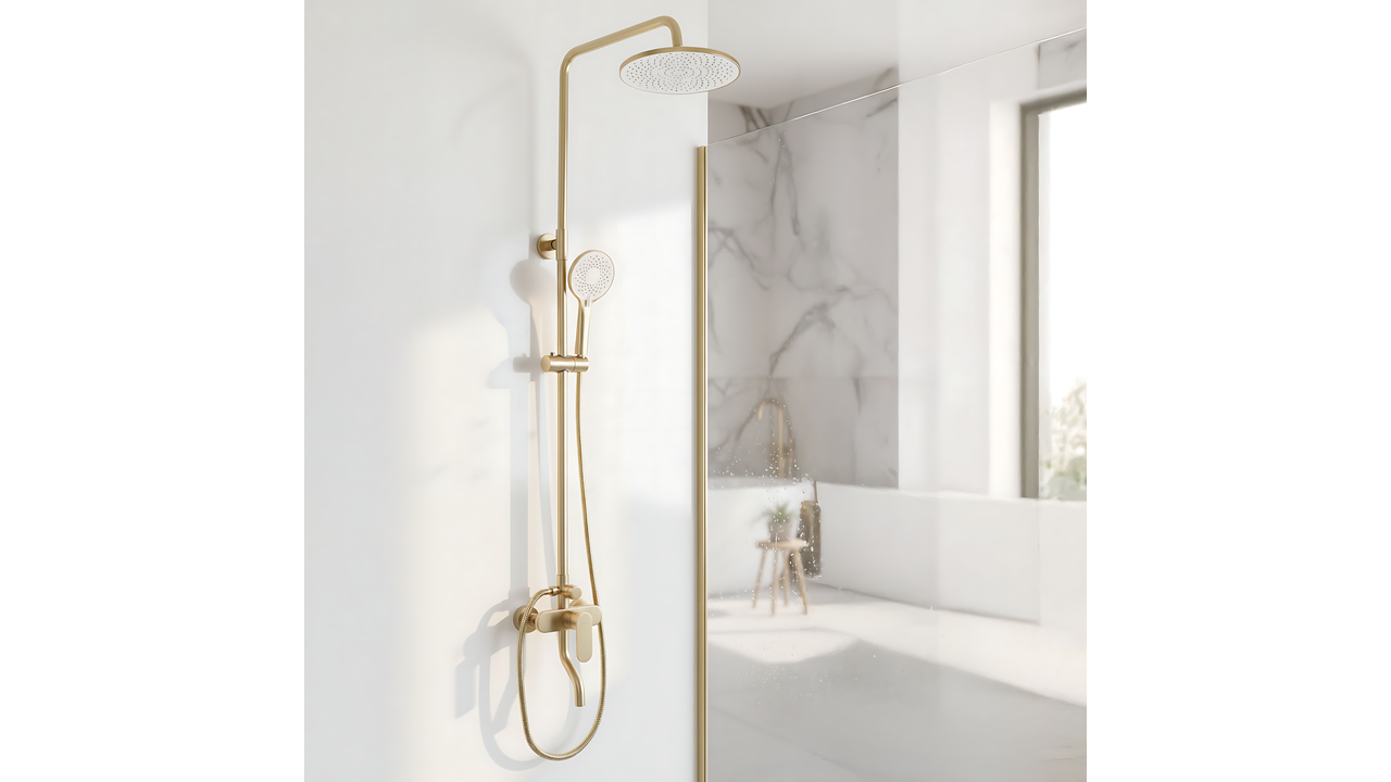Le set de douche en élégant or brossé est une solution moderne et fonctionnelle qui met en valeur le caractère unique de votre salle de bain. Son design minimaliste associé à une finition luxueuse rend ce set parfait pour les intérieurs glamour comme contemporains.