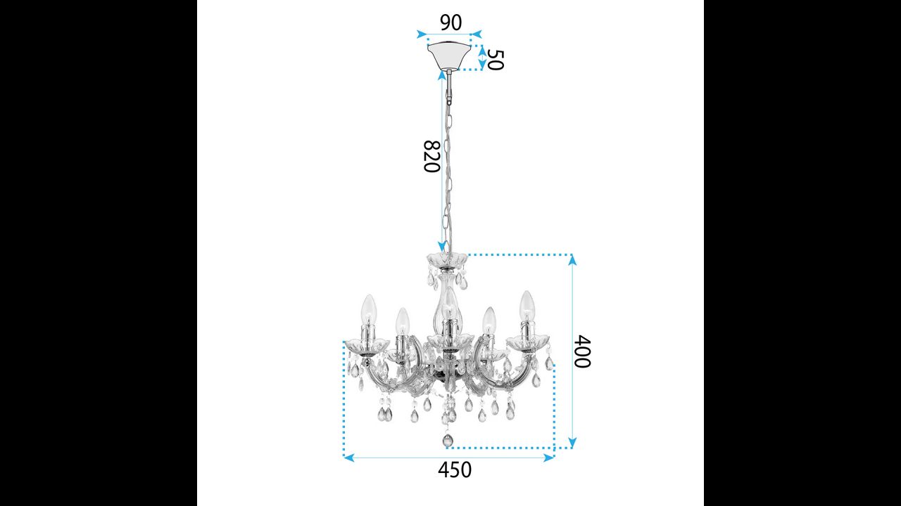 Lustre à cinq bras en finition chrome avec pampilles transparentes. La silhouette équilibrée diffuse une lumière homogène ; la hauteur réglable (jusqu’à 123 cm) facilite l’installation au-dessus de la table.