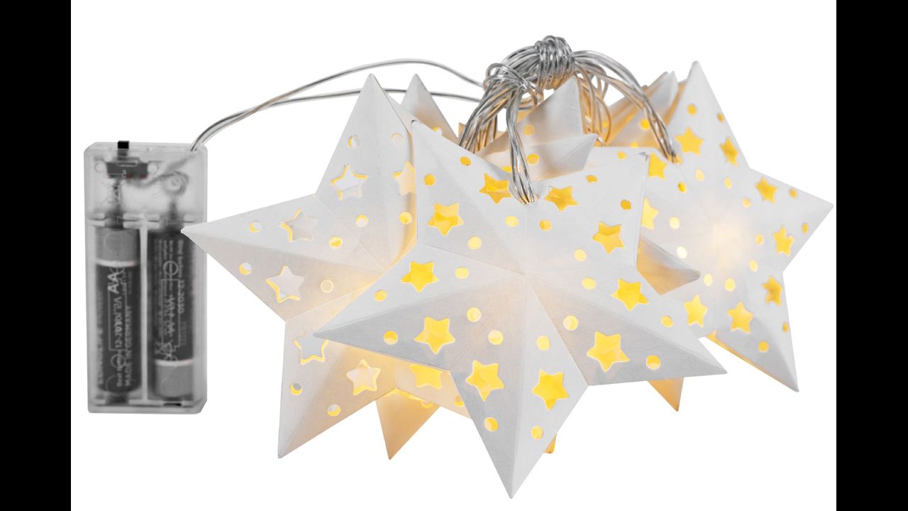 Zestaw lampek składa się z 10 wiszących gwiazdek Led o wymiarze 10×10 cm. Długość girlandy wynosi 120 cm. Lampi zasilane są na 2 baterie AA (brak w zestawie)