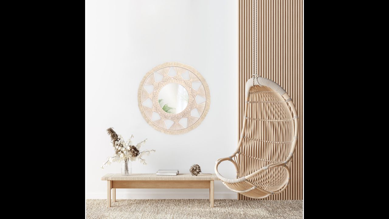 Le miroir est fabriqué à partir de fibres naturelles de haute qualité, ce qui lui confère une texture magnifique et unique. Chaque pièce a son propre caractère. Parfait pour n’importe quelle pièce, salon, salle de bain, cuisine, hall d’entrée, terrasse ou belvédère. Partout où vous rêvez d’un style boho unique.