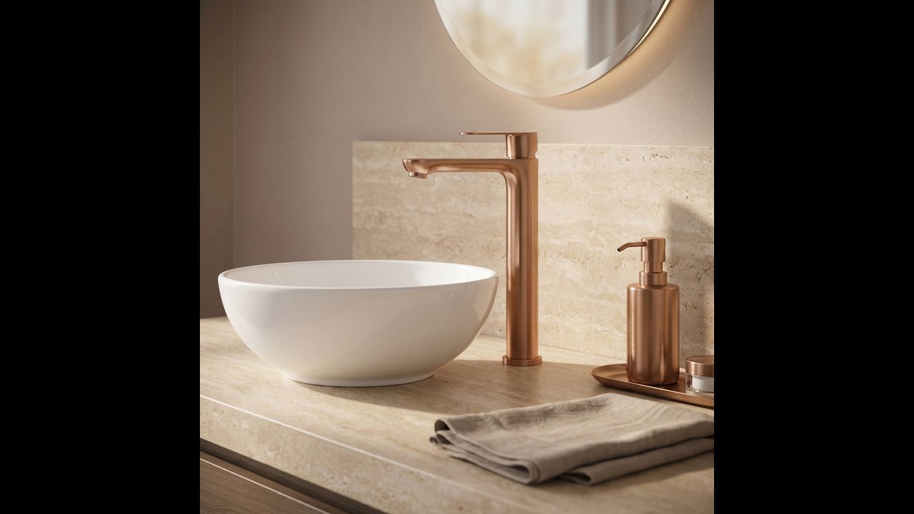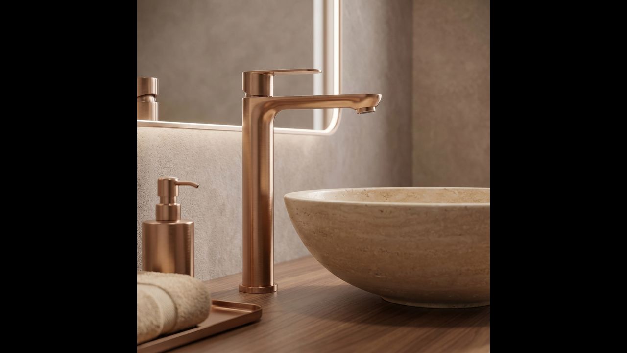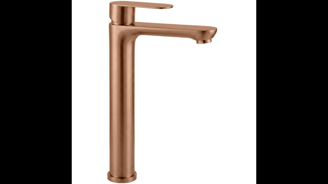 Le mitigeur de lavabo haut Logan de couleur Brushed Copper est une solution élégante conçue pour les salles de bains modernes. Grâce à sa hauteur, ce modèle est idéalement adapté pour un montage directement sur le plan de travail, à côté des lavabos à poser.