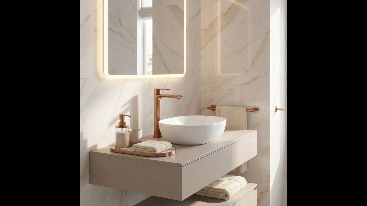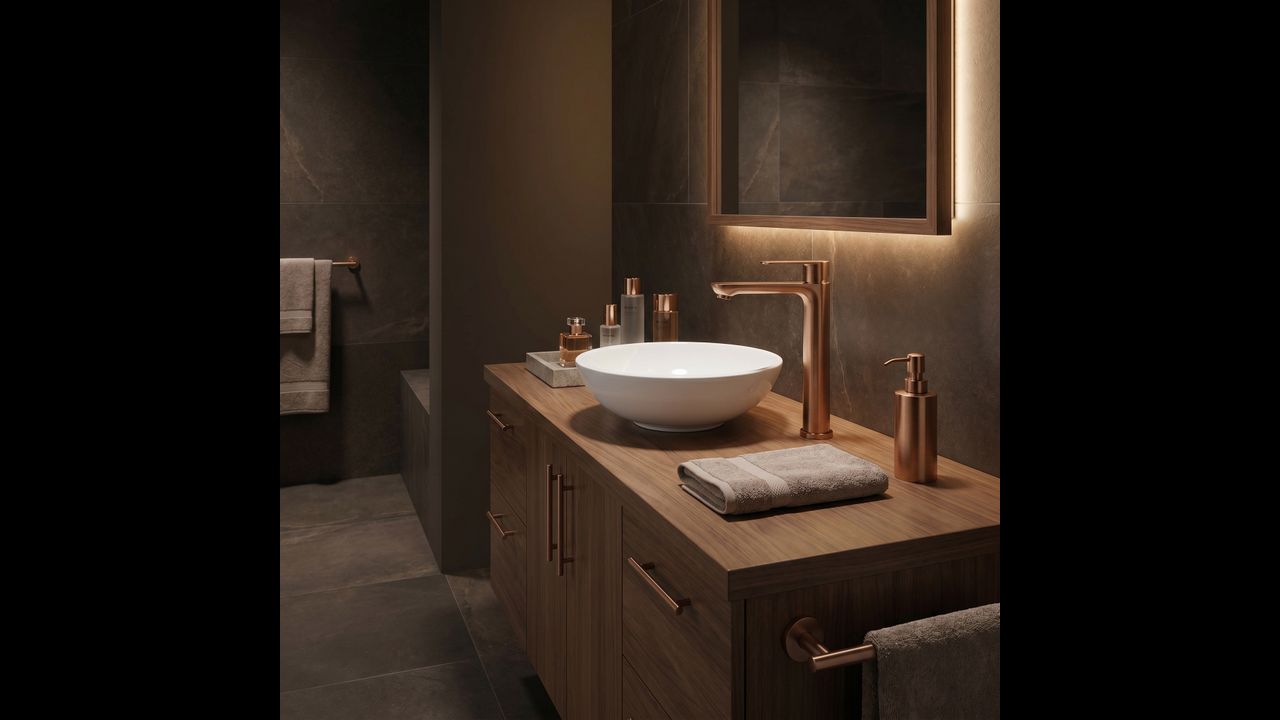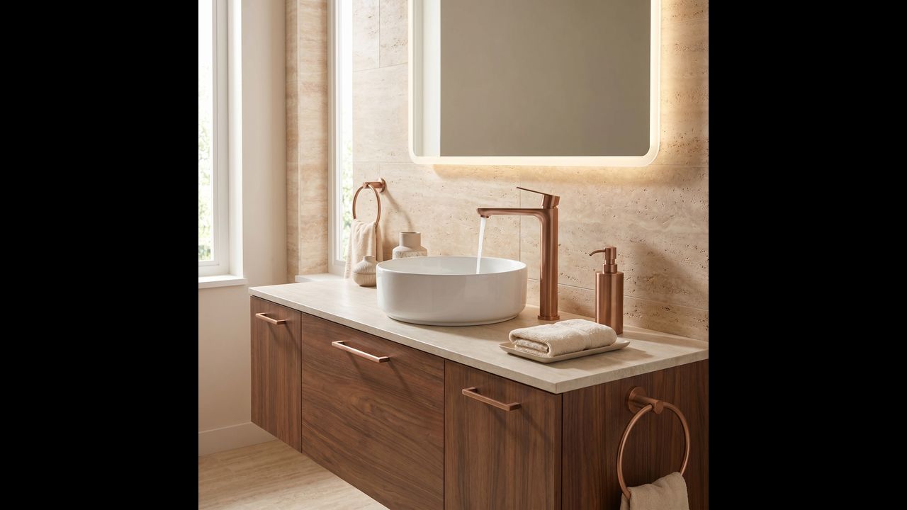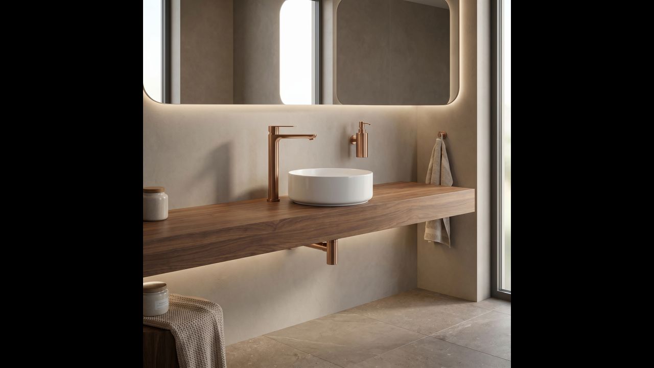 Le mitigeur de lavabo haut Logan de couleur Brushed Copper est une solution élégante conçue pour les salles de bains modernes. Grâce à sa hauteur, ce modèle est idéalement adapté pour un montage directement sur le plan de travail, à côté des lavabos à poser.