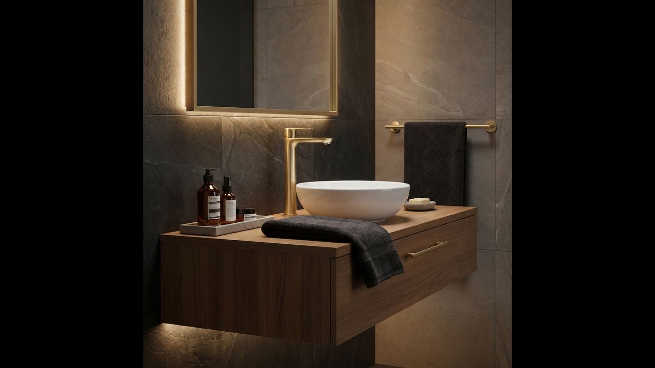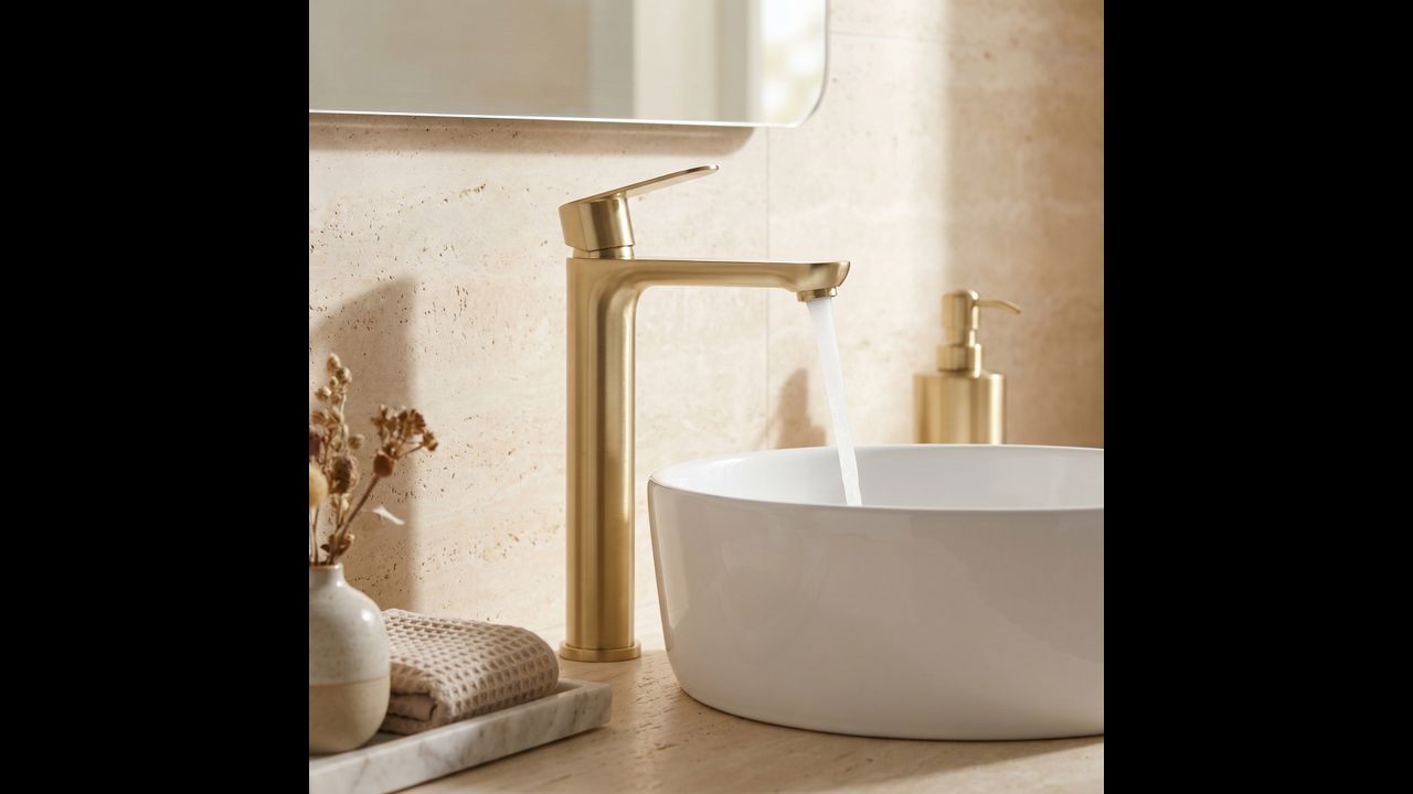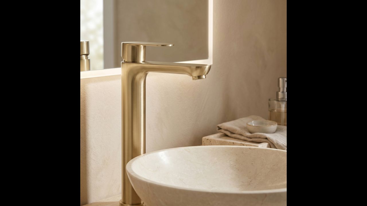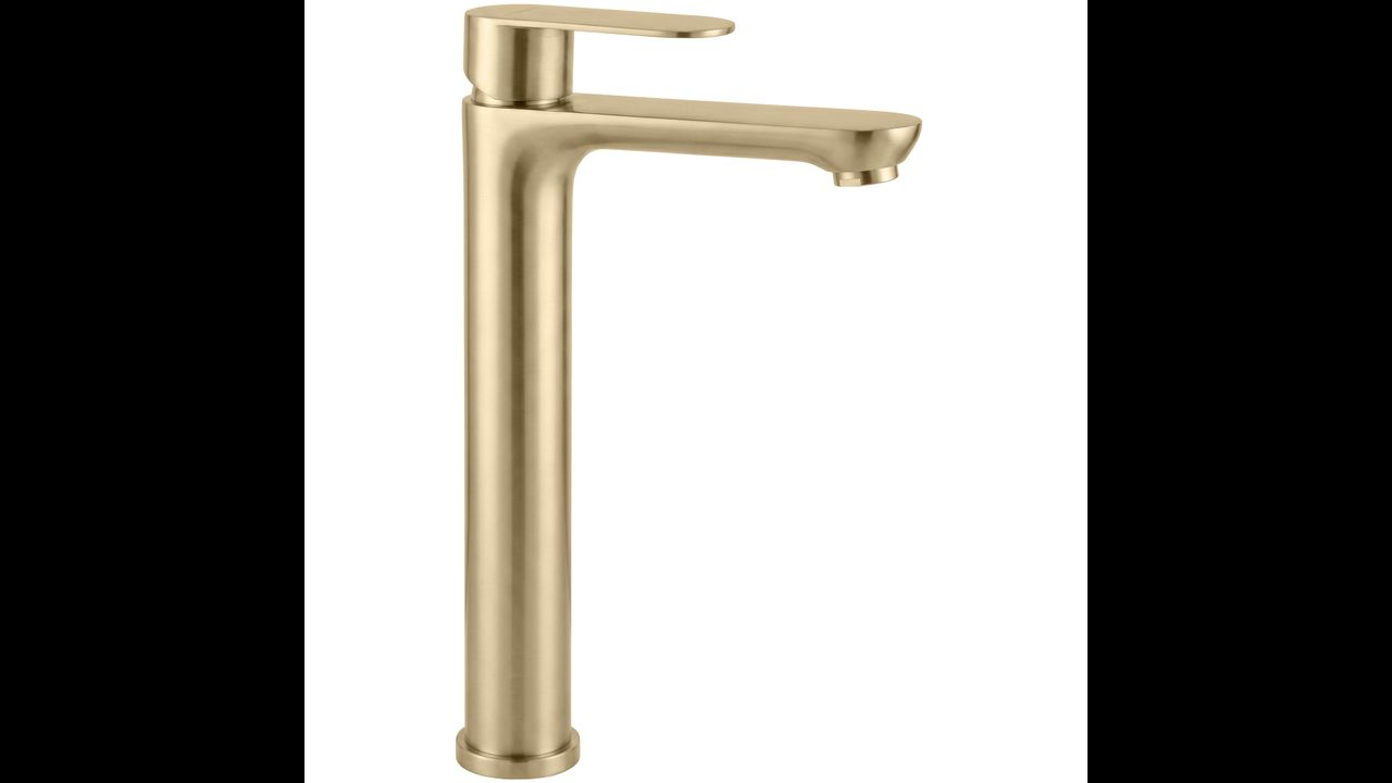 Le mitigeur de lavabo haut Logan de couleur Brushed Gold est une solution élégante conçue pour les salles de bains modernes. Grâce à sa hauteur, ce modèle est idéalement adapté pour un montage directement sur le plan de travail, à côté des lavabos à poser.