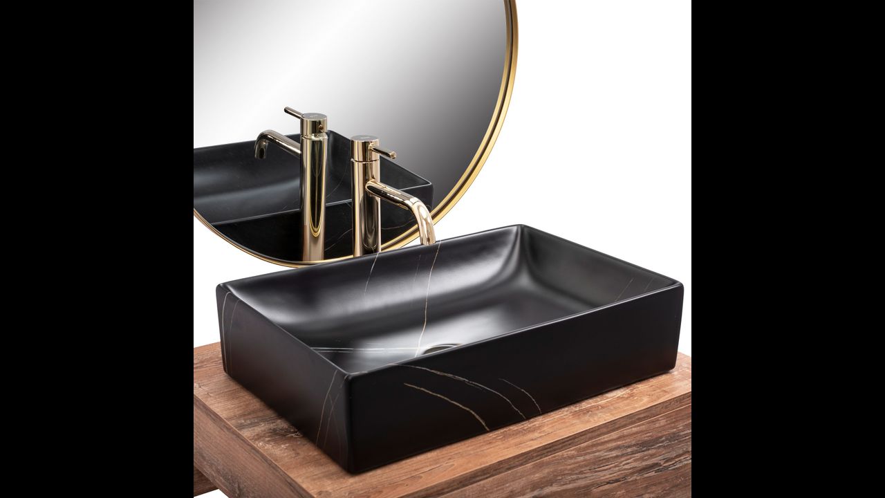 Le magnifique et très fonctionnel lavabo Inga en noir avec des veines dorées imitant la pierre naturelle. Chaque pièce a un design unique et inimitable. C’est un produit qui remplira parfaitement l’espace de votre salle de bain tout en conservant une apparence et une esthétique intérieure impeccables. Le lavabo peut être monté sur un plan de travail ou sur une armoire. Grâce à une phase de production spéciale, il est durable et facile à nettoyer. La qualité supérieure de la céramique sanitaire avec une finition noire mate attirera l’attention de tous.