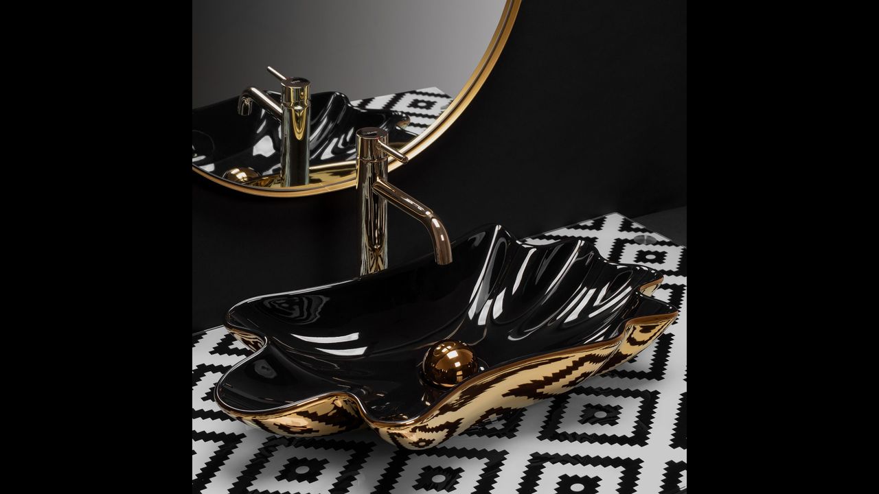 Le lavabo est fabriqué en céramique de la plus haute qualité, de couleur noire et de forme ovale et ondulée. La vasque est finie avec un rebord en or, ce qui donne une belle touche finale. Le lavabo est incroyablement attrayant à l’œil, il est idéal pour les amateurs de formes non standard, apportant de l’élégance au design de la salle de bains à la maison et au bureau.