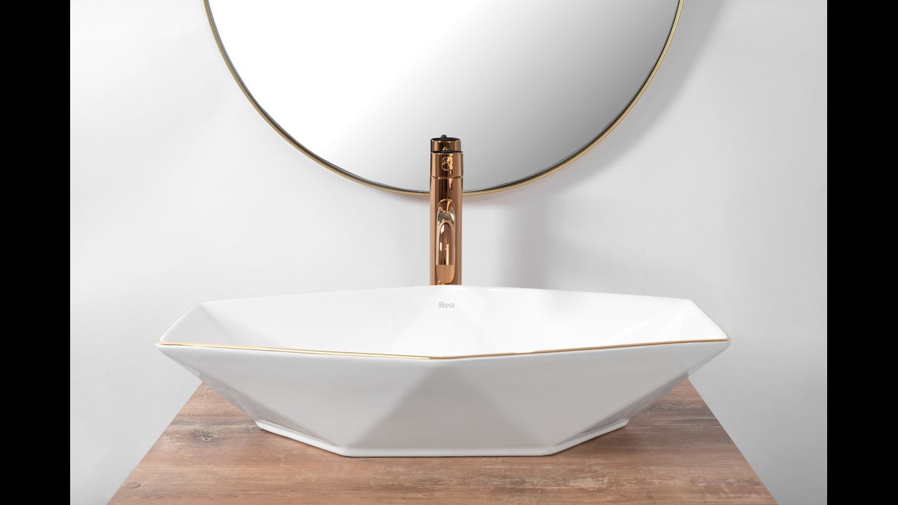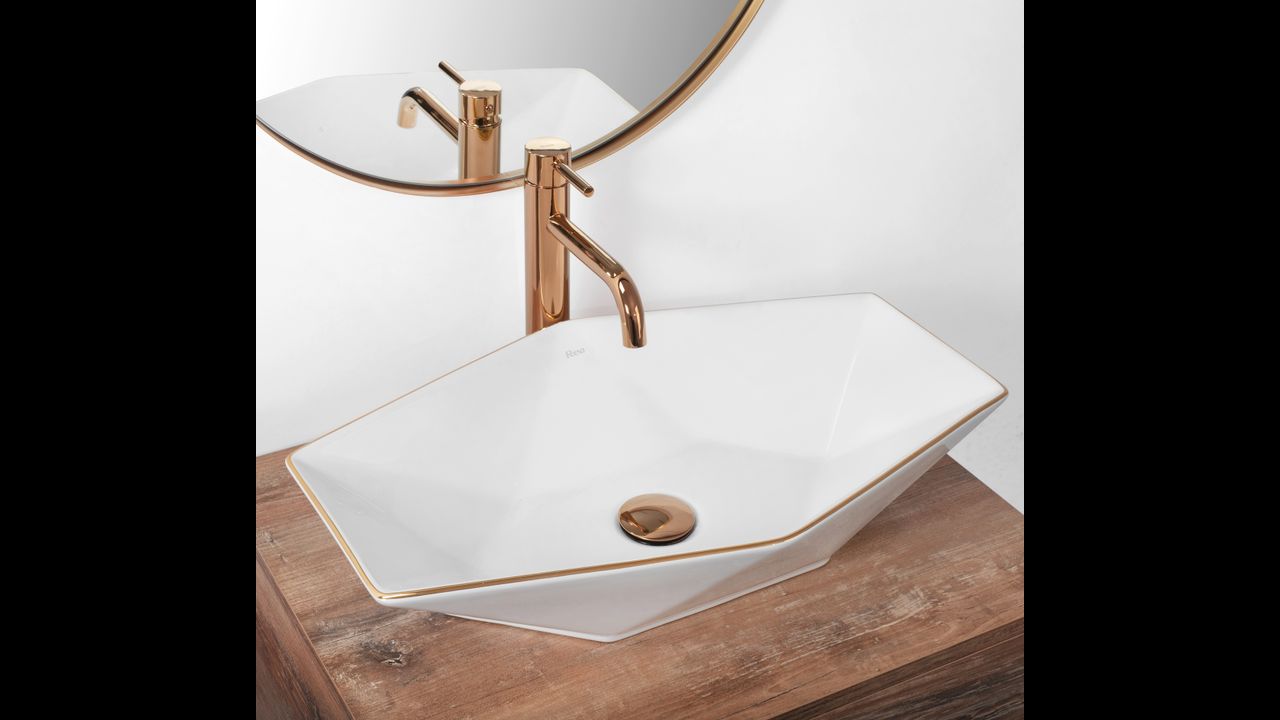 Un beau lavabo extrêmement fonctionnel et moderne en blanc neige avec un bord en or rose. C’est un produit qui remplira parfaitement l’espace de votre salle de bains tout en conservant une apparence et une esthétique intérieure impeccables.